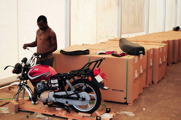 Ghanaian workers have been assembling 400 motorbikes which Germany will hand over on 1 December 2014 for the Ebola Response. Photo: UNMEER/Simon Ruf