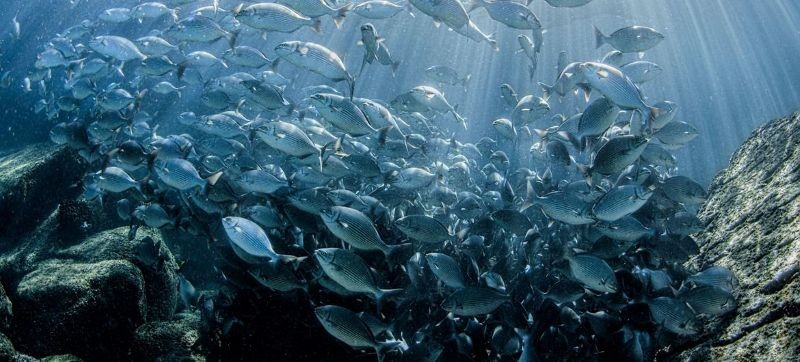 Photo: A school of fish swims close to Los Islotes Island in La Paz, Mexico. Photo: Ocean Image Bank/Amanda Cotto