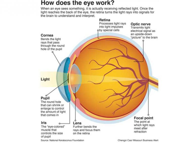 That damage interrupts the complicated process of sight. Vision involves light, with eyes controlling and directing light to a single point located at the back of the organ before transferring information to the brain.