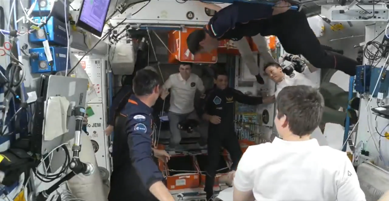 He is accompanied by mission specialists Slawosz Uznanski-Wisniewski (Poland), Tibor Kapu (Hungary) and Commander Peggy Whitson (United States).