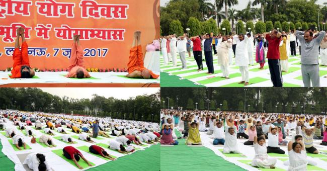Around 1500 participants from Patanjali YogPeeth, Gayatri Pariwar, Art of Living, Mokshayatan, Brahmakumaris, NSS, NCC volunteers, Yoga Department, Lucknow University, Isha Foundation and Indian Yoga Institute participated in the Yoga Session.
