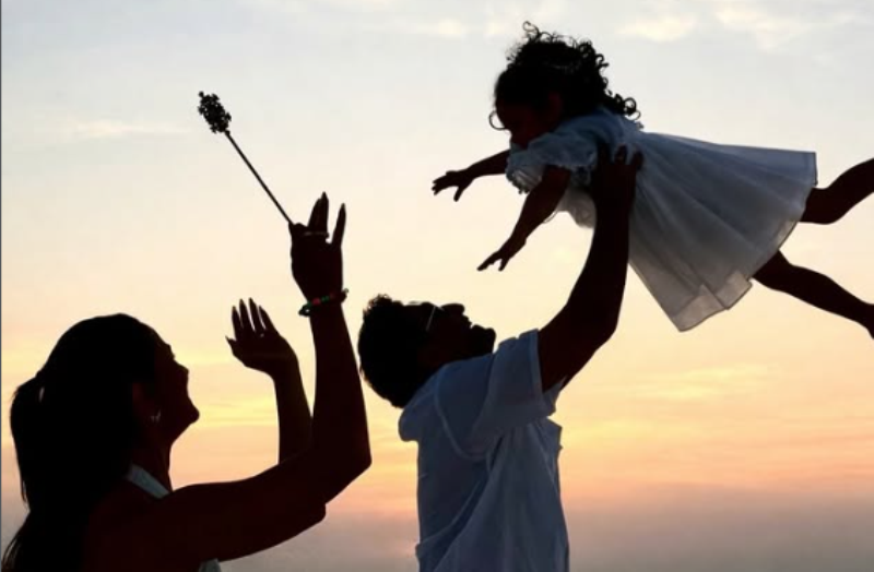 In the image, Ranbir is seen lifting little Raha in his arms as Alia stands behind them, holding a fairy wand, symbolising joy and togetherness.