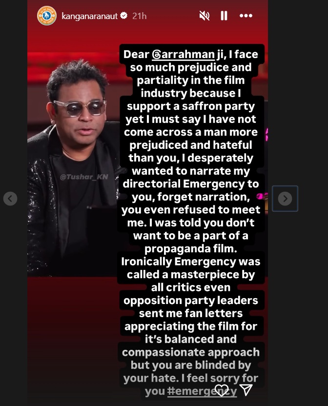 Actor-filmmaker Kangana Ranaut on Saturday accused Oscar-winning composer AR Rahman of being “prejudiced and hateful,” alleging that he refused to associate with her directorial film Emergency because he considered it a “propaganda film.”