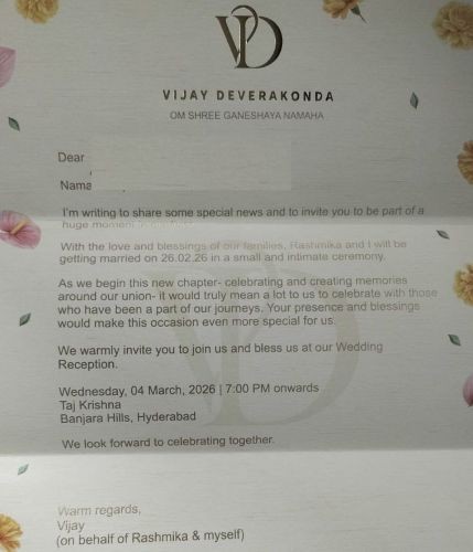 The invite read that the wedding would be held with the “love and blessings of our families” and invited close friends and well-wishers to celebrate the couple’s union at the reception. The note is signed by Vijay Deverakonda “on behalf of Rashmika & myself.”