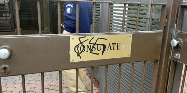 Miscreants have have drawn Swastikas on the embassy gates, situated in the Israeli city.
