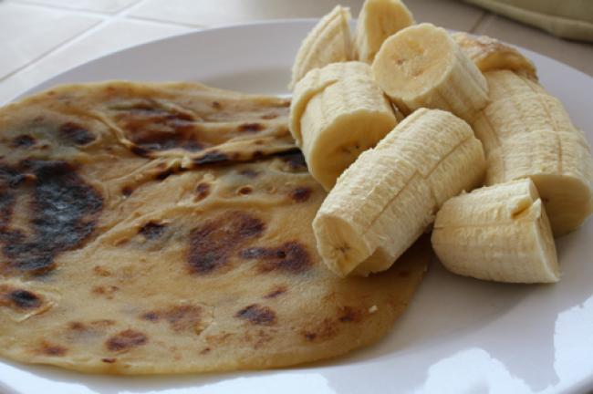 2. Mix the flour, bananas, 2 tsp ghee, sugar and salt in a bowl.