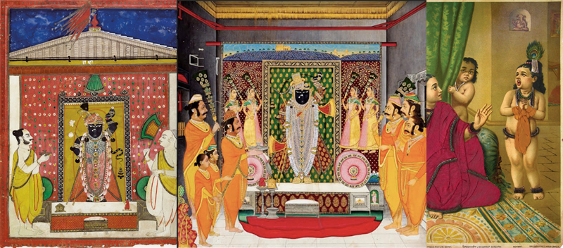 In Nathdwara paintings the images are painted in bright colours and fluid strokes bringing alive the ritus –seasons, and the festivities around them all concentrated on Shrinathji, indicating “an early tradition in the worship of painted images.”