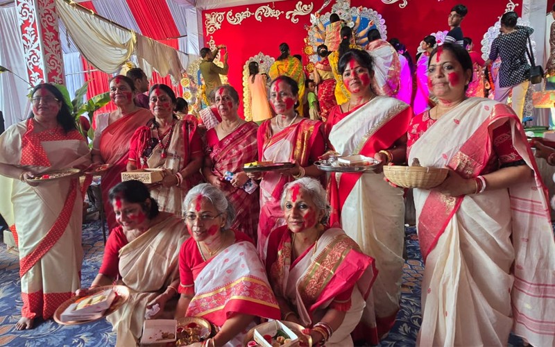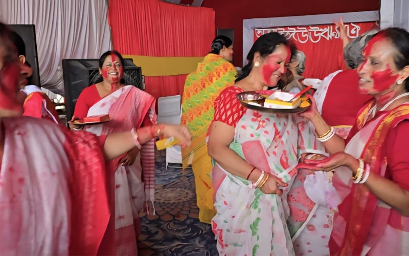 From Anondomela ( Shosti) to dhunuchi naach (Ashtami) and finally the sindoor khela ( Dashami), each ritual welcomes people from every community, turning the pandal into a cultural bridge. The last day of the Puja is filled with deep significance as married women offer sweets and vermilion to the Goddess during sindoor khela, before smearing each other’s faces in red — praying for marital bliss for all, including their beloved Durga.