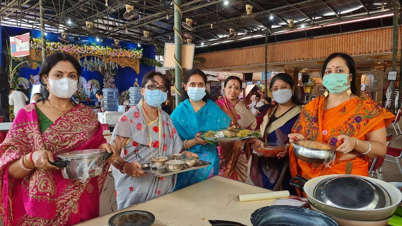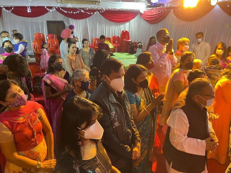In pre-Covid times some 250 to 500 people would attend the aarti or the puja. Due to restrictions this year they allowed only 50 people. "After aarti we run a live snacks counter. People participate to make snacks which range from golgappa (fuchka), veg pakora, papri chat, bhelpuri, etc. This is followed by Prasad. Menu is different on different days of the puja. The cooking is without onion and garlic."