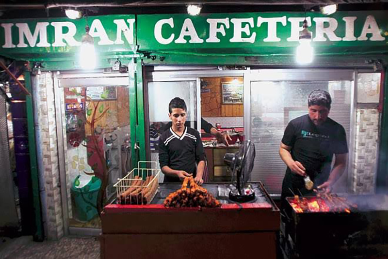 A street at Khayam Chowk in Srinagar city has been popular for decades for its delectable street food, especially Seekh Kebab and Kanti (Mutton Kanti or Tujj is marinated shallow fried mutton pieces- barbequed over blazing red embers- and cooked again in spicy gravy).