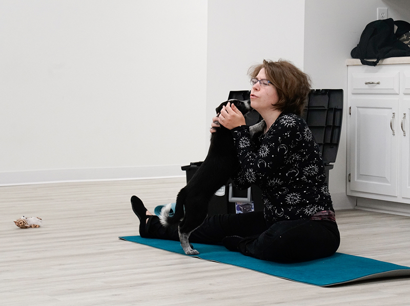 Members of a puppy yoga class play with puppies at Selfie Love in Columbia. (Photo by Lucas Owens)