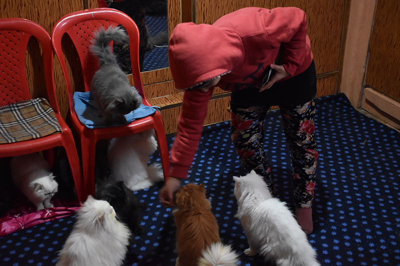 Aayat feeding her cats on Jan. 9, 2022, in Kashmir, India. She owns more than 12 cats. (Photo by Amir Bin Rafi)