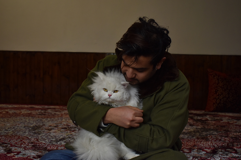 Tahir sits with his cat, Snowbear on Jan. 12, 2022. in Kashmir, India. (Photo by Amir Bin Rafi)