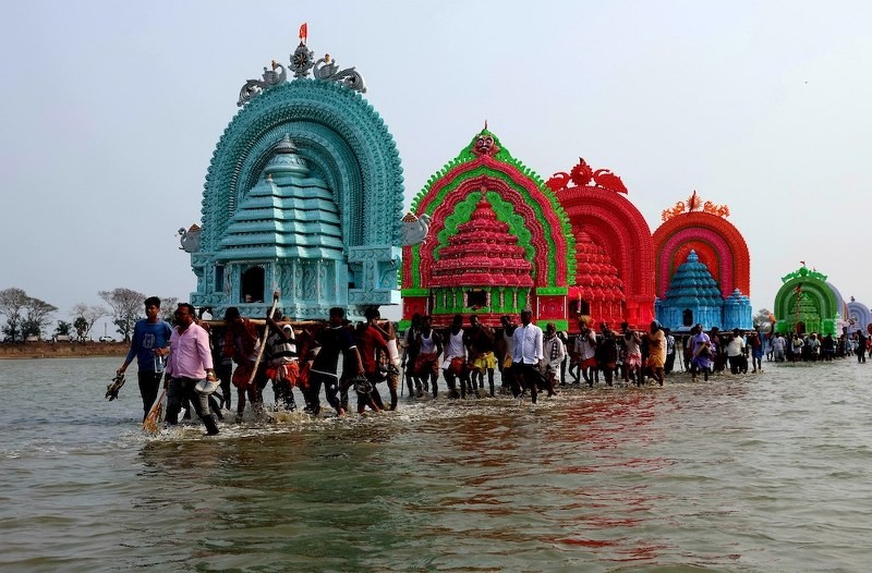 At Parikuda, the celebration carries a distinctive character. Idols of Radha-Krishna and other deities from temples across nearly two dozen surrounding villages are brought in ornate palanquins known as Dola Bimanas. Devotees then carry them through the shallow waters of Chilika Lake, creating a moving tableau of colour, devotion and rhythmic chanting.
