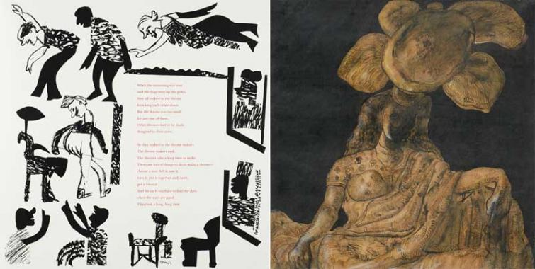 The exhibition includes original lithographs and collaged pages of two seminal books.