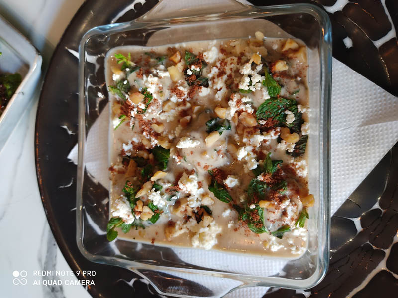 Then pour the sauce on the cooked ball. Garnish with mint leaves, roasted walnuts and feta cheese.