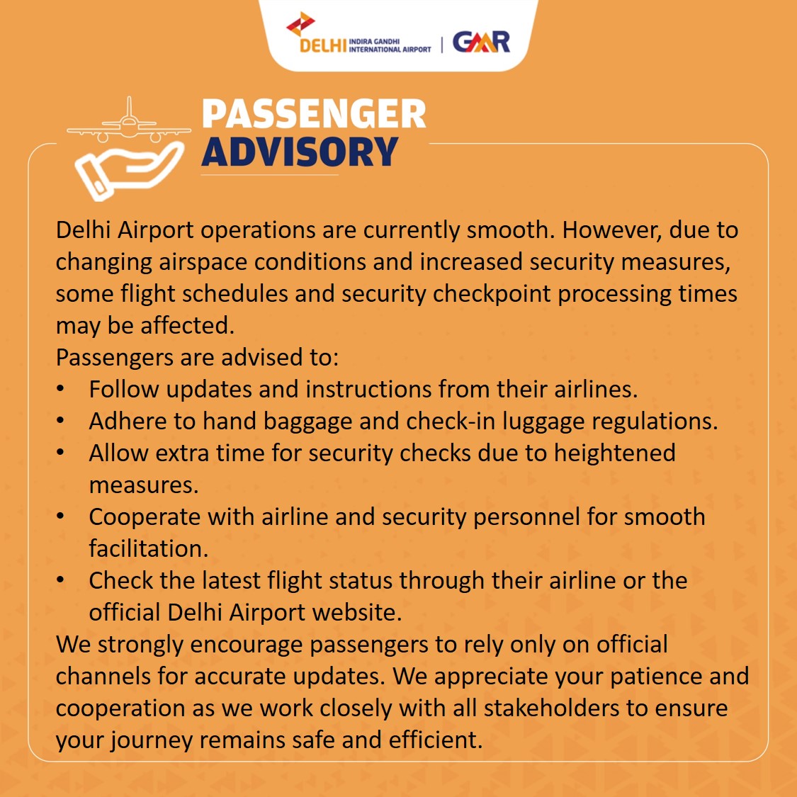 May 12, 2025, at 07:39 amThe Delhi Airport said, "Operations are currently smooth, but changing airspace conditions and increased security measures may cause delays in flight schedules and longer processing times at security checkpoints."