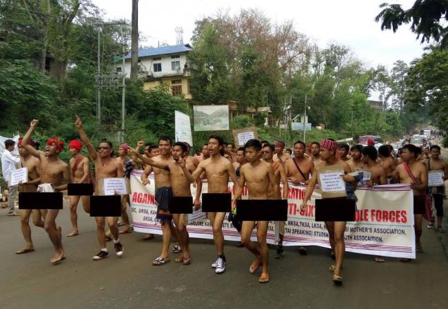 The members of 24 tribal organizations staged nude protest at Diphu town in the hills district and demanded to change electoral rolls ahead of the council poll.