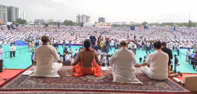 Lakhs of Yogis joined @yogrishiramdev,@AmitShah, @vijayrupanibjp, @anandibenpatel, @Nitinbhai_Patel at GMDC ground in Ahmedabad for #IDY2017 pic.twitter.com/WWuFSgKHzZ