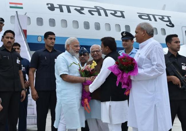 On arrival, Prime Minister Modi was welcomed by the Governor of Uttar Pradesh Ram Naik and the state's Chief Minister Akhilesh Yadav,