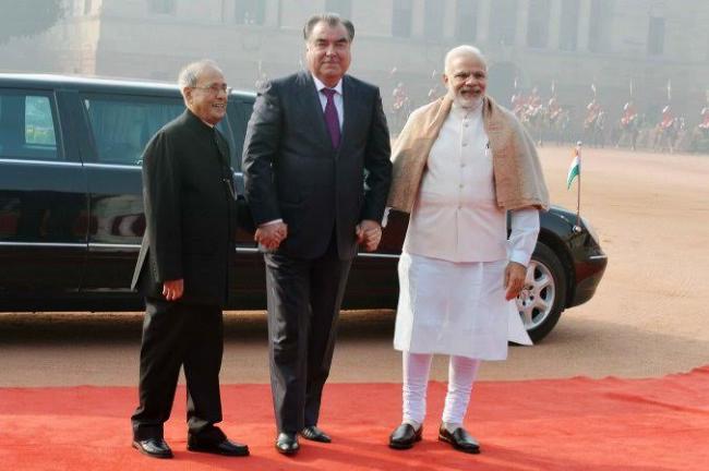 New Delhi, Dec 17 (IBNS): President Pranab Mukherjee and Prime Minister Narendra Modi on Saturday morning welcomed Tajikistan President Emomali Rahmon at the Rashtrapati Bhavan.