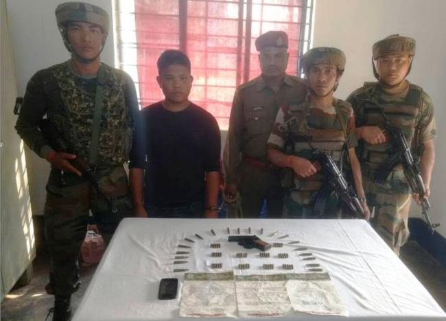 The nabbed militant was identified as Polning Sangma and security personnel recovered one Country made pistol, 70 rounds of live ammunition, one mobile phone and three GNLA demand notes from the individual.