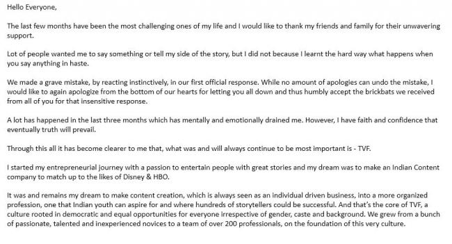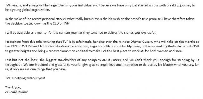 The CEO cited the damage brought on the brand image of TVF due to the allegations against him, prompted to take the decision of quitting, though he would continue as a mentor for the content team.