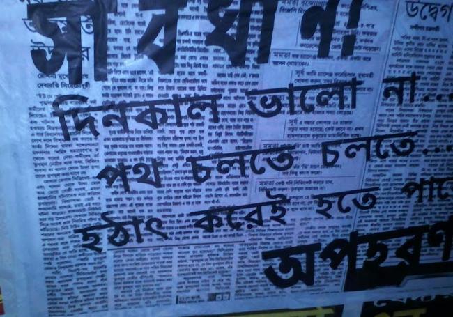 "These posters have been published in Bengali, where they wrote: Sabdhan, Dinkaal valo na. Poth cholte cholte hothat korei hote paren opohoron! (English meaning: Caution! Recent time is not good, you could be abducted anytime while walking on roads)," Raja Majumder, a local resident of Jalpaiguri city, told IBNS.