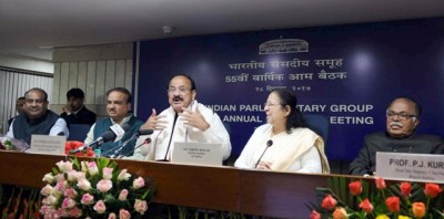 The Vice President, M. Venkaiah Naidu addressing the gathering releasing the Lok Sabha Calendar for the year 2018, in New Delhi on December 28, 2017. The Speaker, Lok Sabha, Sumitra Mahajan, the Union Minister for Chemicals & Fertilizers and Parliamentary Affairs, Ananth Kumar and other dignitaries are also seen.