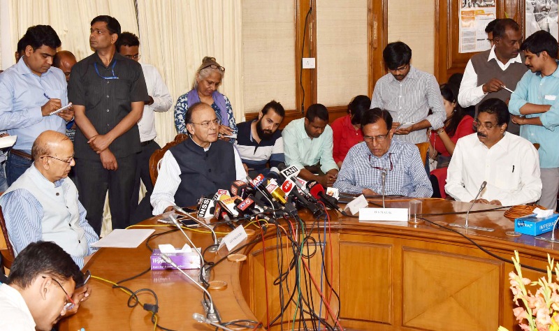The Union Minister for Finance and Corporate Affairs, Arun Jaitley addressing the media on the issues relating to Andhra Pradesh, in New Delhi on March 07, 2018. The Secretary, Department of Expenditure, Ajay Narayan Jha is also seen.