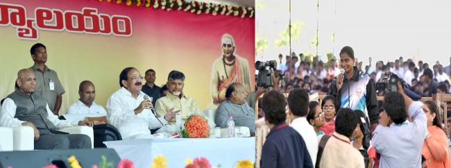 The Vice President, M. Venkaiah Naidu addressing the gathering after laying Foundation Stones for University Arts College and University Botanical Garden, inaugurating Amenities Centre & NTR Convention Centre at Adikavi Nannaya University, in Rajahmundry, Andhra Pradesh on November 06, 2017. The Governor of Andhra Pradesh, E.S.L. Narasimhan, the Chief Minister of Andhra Pradesh, N. Chandrababu Naidu and the Deputy Chief Minister of Andhra Pradesh, N. Chinarajappa are also seen.