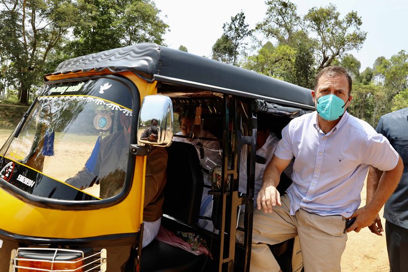 WAYANAD, APR 4 (UNI):- Congress leader Rahul Gandhi riding an auto rickshaw with auto driver Shareef V V,in Kalpetta,in Wayanad, Kerala on Sunday.