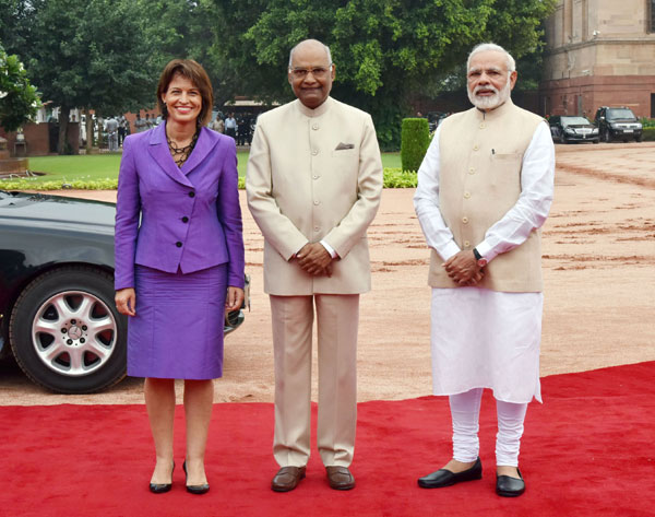 The President of Switzerland,Doris Leuthard being received by the President,Ram Nath Kovind and the Prime Minister,Narendra Modi, at the Ceremonial Reception, at Rashtrapati Bhavan, in New Delhi on August 31, 2017.