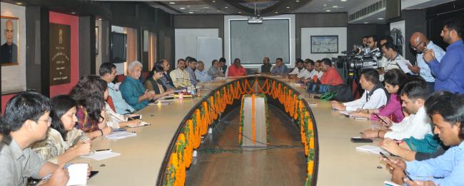 The Minister of State for Communications (I/C) and Railways, Manoj Sinha addressing a press conference, in New Delhi on November 07, 2017. The Secretary, (Telecom), Aruna Sundararajan is also seen.