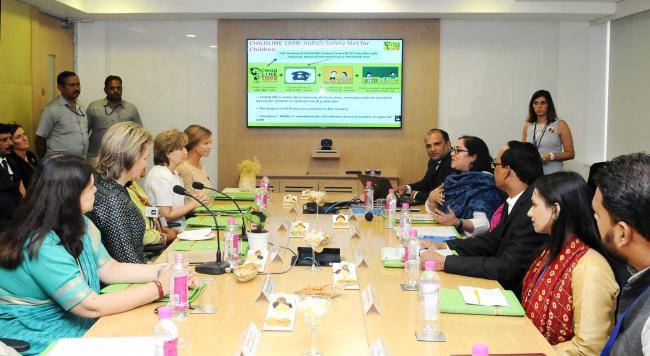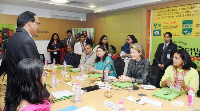 Her Majesty The Queen Mathilde of Belgium along with the Union Minister for Women and Child Development, Maneka Sanjay Gandhi visiting the Childline (1098) Contact Centre of Ministry of Women and Child Development, in Gurugram, Haryana on November 07, 2017.