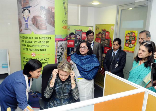 Her Majesty The Queen Mathilde of Belgium taking a firsthand experience of the distress calls received by the Childline (1098) Contact Centre of Ministry of Women and Child Development, in Gurugram, Haryana on November 07, 2017. The Union Minister for Women and Child Development, Maneka Sanjay Gandhi and the Secretary, Ministry of Women and Child Development, Rakesh Srivastava are also seen.