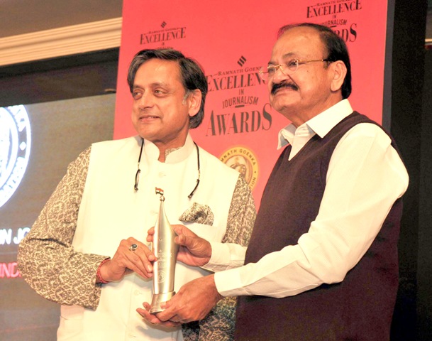 The Vice President, M. Venkaiah Naidu presenting the 12th Ramnath Goenka Awards for Excellence in Journalism, in New Delhi on December 20, 2017. The Chairman and Managing Director of the Express Group, Viveck Goenka is also seen