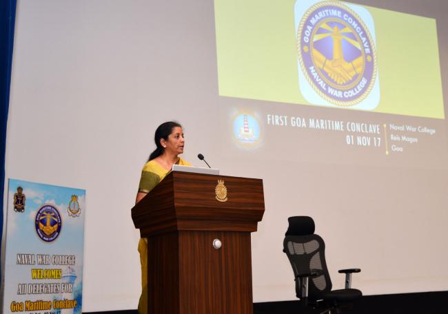 The Union Minister for Defence, Nirmala Sitharaman addressing at the inauguration of the Goa Maritime Conclave, at Naval War College, in Goa on November 01, 2017.