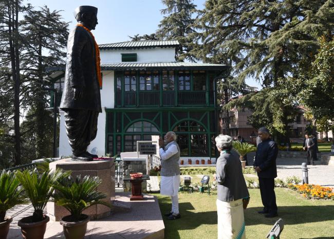 The Prime Minister, Narendra Modi offering the floral tributes on the statue of the former Prime Minister, Lal Bahadur Shastri, at the Lal Bahadur Shastri National Academy of Administration (LBSNAA), in Mussoorie, Uttarakhand on October 26, 2017.