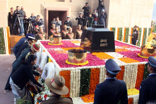 The Union Minister for Defence, Nirmala Sitharaman, the Chief of Army Staff, General Bipin Rawat, the Chief of the Air Staff, Air Chief Marshal B.S. Dhanoa and the Vice Chief of Naval Staff, Vice Admiral Ajit Kumar P laying wreath at Amar Jawan Jyoti, India Gate, on the Occasion of Vijay Diwas, in New Delhi on December 16, 2017.