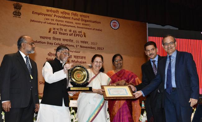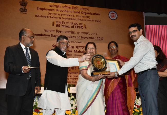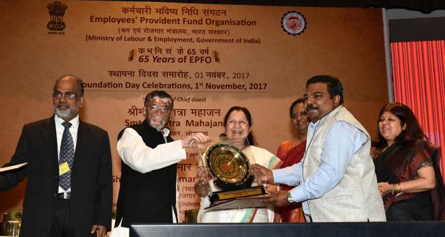 The Speaker, Lok Sabha, Sumitra Mahajan presenting the awards, at the celebration of 65th Foundation Day of Employees’ Provident Fund Organisation (EPFO), in New Delhi on November 01, 2017. The Minister of State for Labour and Employment (I/C), Santosh Kumar Gangwar and the Secretary, Ministry of Labour & Employment, M. Sathiyavathy are also seen.