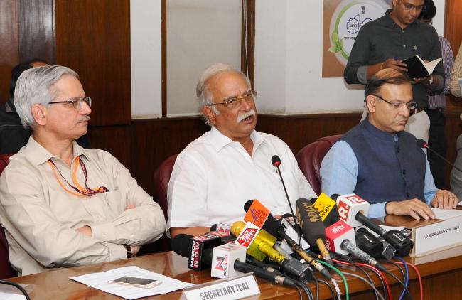 The Union Minister for Civil Aviation, Ashok Gajapathi Raju Pusapati briefing the media on the proposed Civil Aviation Requirements regarding Unmanned Aircraft System (UAS)/ Drones, in New Delhi on November 01, 2017. The Minister of State for Civil Aviation, Jayant Sinha and the Secretary, Ministry of Civil Aviation, R.N. Choubey are also seen.