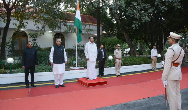 The Vice President, M. Venkaiah Naidu inspecting the Guard of Honour, on his arrival, in Raipur, Chhattisgarh on November 01, 2017. The Chief Minister of Chhattisgarh, Dr. Raman Singh is also seen.