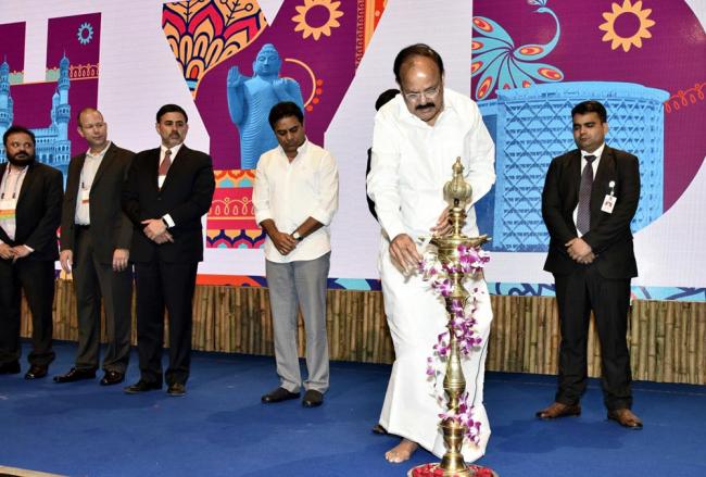 The Vice President, M. Venkaiah Naidu at an event to inaugurate the Entrepreneurs’ Organisation Global University Conference 2017, in Hyderabad on October 25, 2017. The Minister for IT, Municipal Administration & Urban Development, Industries & Commerce, Public Enterprises, Sugar, Mines & Geology, NRI Affairs, Telangana, K.T. Rama Rao is also seen.