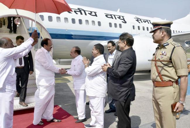 The Vice President, M. Venkaiah Naidu being received by the Deputy Chief Minister of Telangana, Mohammad Mahmood Ali, on his arrival, in Hyderabad on October 25, 2017.
