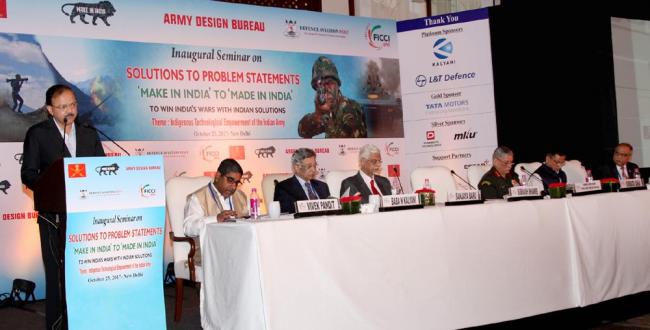 The Minister of State for Defence, Dr. Subhash Ramrao Bhamre addressing the gathering, at a seminar on Solutions to Problem Statements with the theme ‘Indigenous Technological Empowerment of the Indian Army’ in New Delhi on October 25, 2017. The Chief of Army Staff, General Bipin Rawat and other dignitaries are also seen.