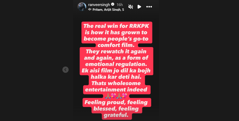 Reacting to the award, Ranveer wrote on his Instagram story, "The real win for RRKPK is how it has grown to become people's go-to comfort film. They rewatch it again and again, as a form of emotional regulation. Ek aisi film jo dil ka bojh halka kar deti hai. That's wholesome entertainment indeed. Feeling proud, feeling blessed, feeling grateful."