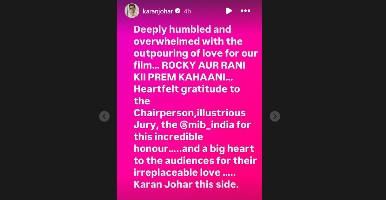 After his film claimed the honour, Karan wrote in an Instagram story, "Deeply humbled and overwhelmed with the outpouring of love for our film... ROCKY AUR RANI KII PREM KAHAAANI... Heartfelt gratitude to the Chairperson, illustrious Jury, the @mib_india for this incredible honour…..and a big heart to the audiences for their irreplaceable love ….."