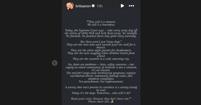 In a similar statement, Varun, Kriti and Janhvi wrote, "They call it a menace, We call it a heartbeat. Today, the Supreme Court says — take every stray dog off the streets of Delhi-NCR and lock them away. No sunlight. No freedom. No familiar faces they greet every morning. But these aren’t just 'stray dogs.'