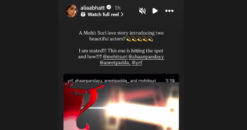 In an Instagram story, Alia wrote, "A Mohit Suri love story introducing two beautiful actors? I am seated!!! This one is hitting the spot and how!!!!!"